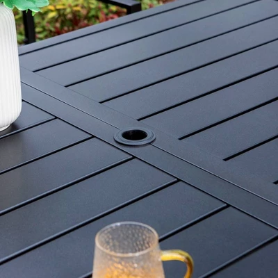 Table: Stylish modern slatted metal top and heavy-duty metal frame with a black powder-coat finish make the table sturdy.