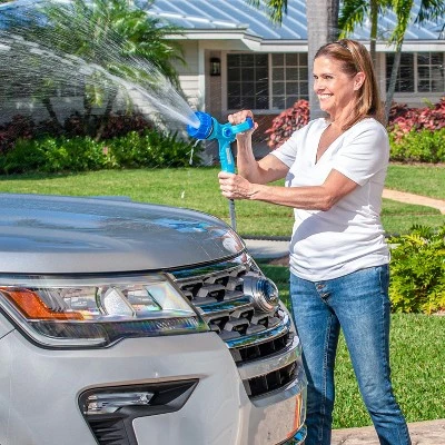 - Fireman’s style hose nozzle — dual-handed, rubberized grip adjusts from gentle spray to high-pressure stream in one smoo