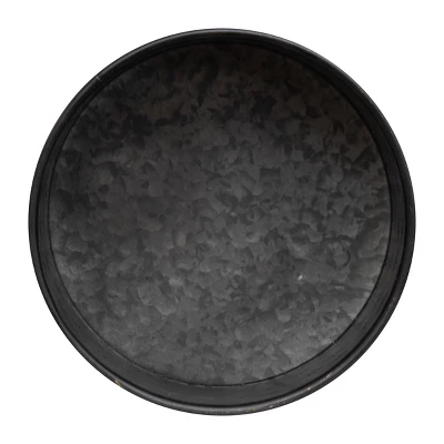 - Embossed metal is finished with a black galvanized finish, contrasted by a warm wood accent stand.