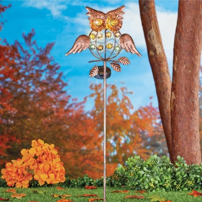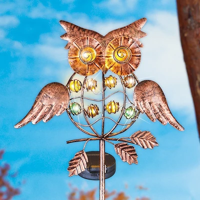 With glass bead accents, this bronze colored owl sparkles in the sun during the day and shines with solar-powered lights at night. LED lights wrap the owl’s body and eyes to add a lovely glow when the sun sets. Solar panel includes 1 “AA” rechargeable battery. Metal, glass and plastic. Approx 8 1/2″L x 30 1/4″H with stake.