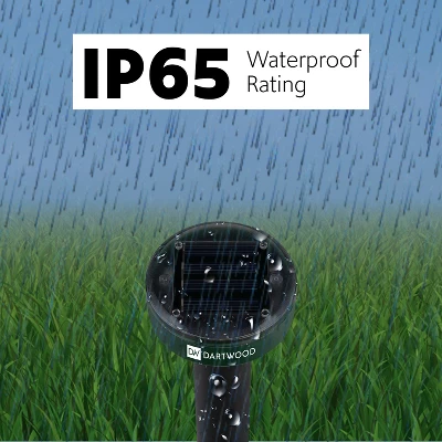 Dartwood Outdoor Solar Sonic Mole Repellent – Remove Groundhogs, Rats, Mice, Snakes, and More From Your Gardens, Lawns, and Yards (4,6 and 8 Pack). The 4, 6 and 8 Pack Solar Repellents from Dartwood will remove groundhogs, rats, and mice from your gardens and lawns. These solar repellants have solar panel and switch button. The solar powered mole repeller is solar powered, weatherproof. It is chemical free, and is safe around pets. It emits sound wave up to 49ft. Its dimensions are 0.93 inch, 8.9 inch, 2.28 inch and 2.28 inch. It has IP65 Waterproof Rating with built-in solar panel. 4 hours of solar charge can last up to 5 days. Low battery may affect efficiency and please plant the device in sunny places.