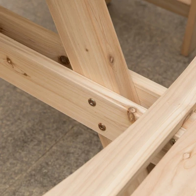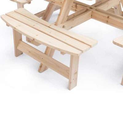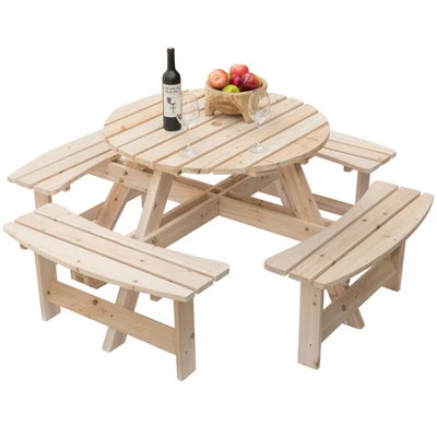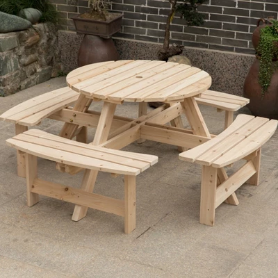 - Gather around this comfortable picnic table for family outdoor meals. Solid wood composition offers durable resilience for continual outdoor use. For extra convenience, insert an umbrella in the center hole for sunlight shade and protection. Plus, when it comes to basic outdoor furnishing, this picnic table is what every outdoor area calls for to dine in warm outdoor weathers.