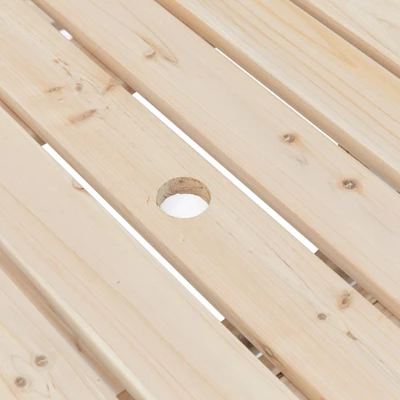 Gather around this comfortable picnic table for family outdoor meals. Solid wood composition offers durable resilience for continual outdoor use. For extra convenience, insert an umbrella in the center hole for sunlight shade and protection. Plus, when it comes to basic outdoor furnishing, this picnic table is what every outdoor area calls for to dine in warm outdoor weathers.