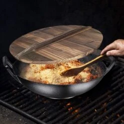 Bruntmor 14″ Enameled Cast Iron Wok Nonstick Skillet Pan With Wooden Pot Lid Cover – Black