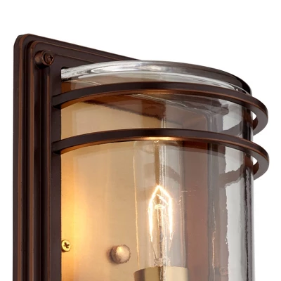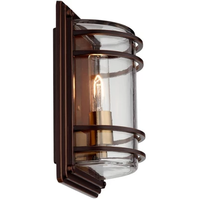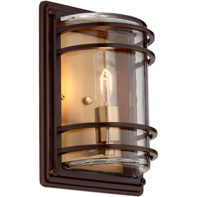 This set of two contemporary outdoor wall lights offers a modern style statement for your home. From the John Timberland collection of home lighting designs, the pocket wall sconce features a handsome industrial look with a bronze finish steel frame set against a warm brass finish backplate. It’s a great addition to a porch or patio wall, and can also be installed indoors to illuminate hallways and more.