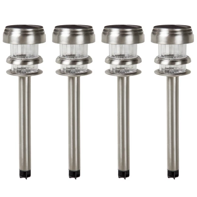 - PRODUCT DETAILS- Dimensions: 11″ (H) x 3″ (L) x 3″ (W). Material: Stainless Steel. Includes: four solar lights, four stakes, and a rechargeable AAA battery. Lasts six hours on a full charge. Lumens: 0.8