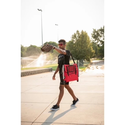 Our Folding Stadium Seat with Arms has a padded seat and backrest that can transform a hard bleacher into a soft place to sit. Features an adjustable shoulder strap for portability, steel tubular-frame for strength and durability, and a lower pocket and large storage pocket on the backrest that is ideal for holding larger materials. Collapsible design with steel hooks on the bottom that can securely attach the seat to all types of bleachers.