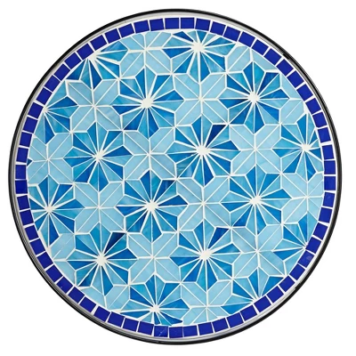 Mosaic patterns show intricate details and incorporate artistic elements and design into this table. This contemporary outdoor accent table has a blue stars-patterned mosaic top and a sleek black frame. This table also has a lower shelf to place a plant or any other type of decor accessory.