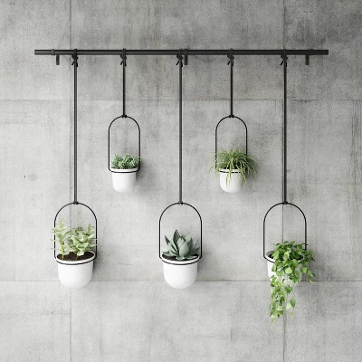 - ADJUSTS HORIZONTALLY AND VERTICALLY: Slide Triflora’s five ropes along the metal rod and adjust their lengths to fully customize the placement of each hanging planter